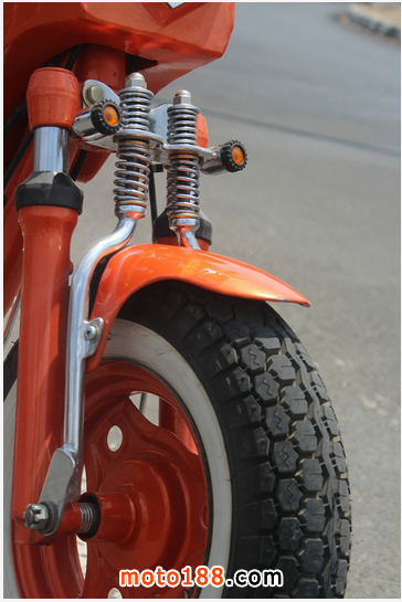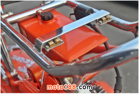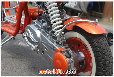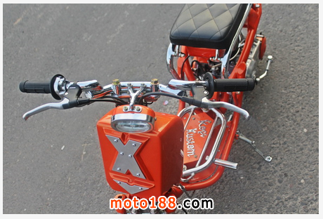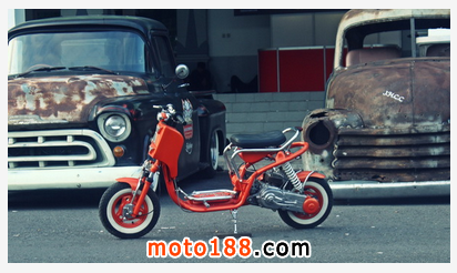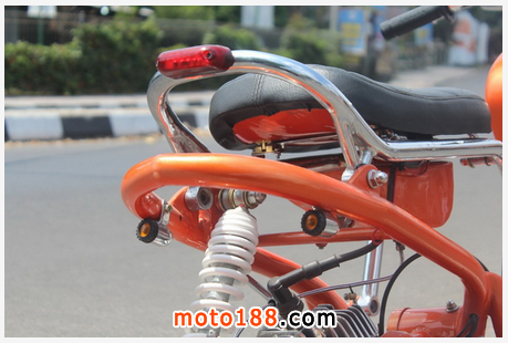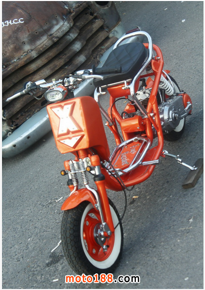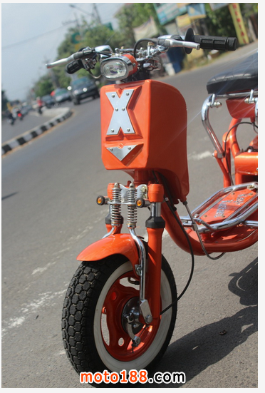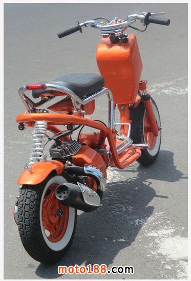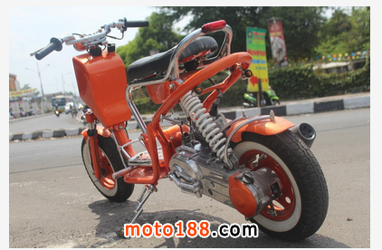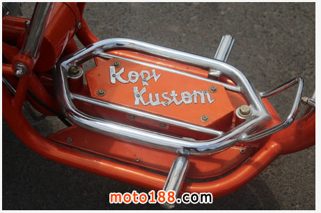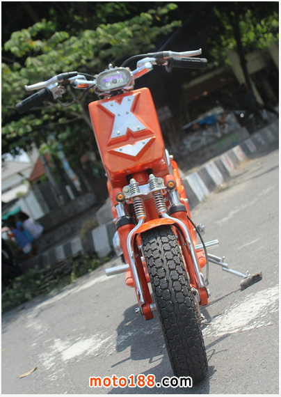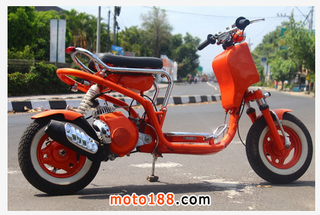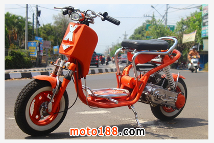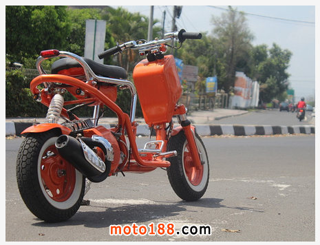 下圖的這部改裝踏板,是來自印尼 K-Kustom Garage 的設(shè)計師 Ariez Thuex 在去年年底的作品。乍眼一看,這車的整體外觀造型有點象 Honda 本土版的 Zoomer(美國版的 Ruckus),盡管已經(jīng) “ 面目全非 ”,但其兩沖程的發(fā)動機,卻讓人難以確認其基礎(chǔ)車體是來自于 Zoomer。而根據(jù)設(shè)計師 Ariez Thuex 表示,這部可愛的作品、其基礎(chǔ)車體是來自于輕騎的 50 cc,如果屬實的話,那么最大的可能估計就是輕騎木蘭了。
