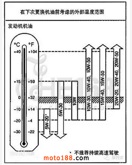 風冷的工作溫度高,相應粘度與級別可以高點。經常跑長途的話,摩托會經常高速行駛,建議SG級別以上,或者合成機油,黏稠度高一點的機油在高速行駛時候發動機會比較有力。就在市區轉悠的話建議粘度低一點,低速行駛會更順暢、更輕快。如:10W-40之類就可以了。