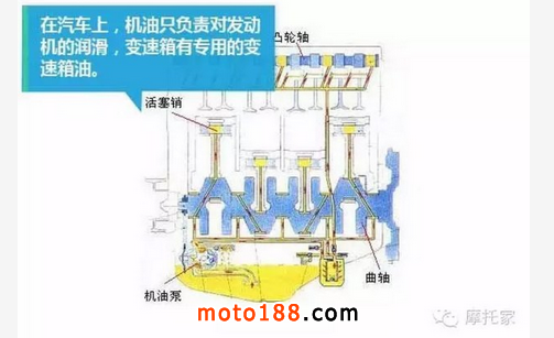 首先,汽車發動機只一個獨立的密閉空間,機油在發動機內部只負責活塞、連桿、曲軸、氣門組等活動部件的潤滑,離合器、變速箱與發動機并不共用油液,它們都有其他專用的油液。摩托車機油則要同時潤滑發動機、離合器、變速箱三個主要部件。