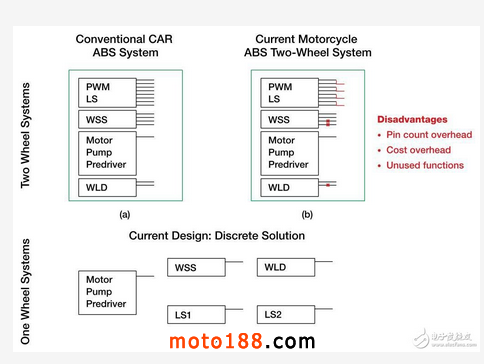 通常,摩托車生產商的一級供應商提供的是雙輪和單輪系統。借助雙輪系統,也可使用針對乘用車設計的ABS AMS IC,因為它擁有足夠的功能。然而,若要保證單輪系統的成本效益,必須采用一種完全不同的方法來實現單輪制動 – 也就是一種獨立設計。這就需要采用兩種完全不同的設計/開發路徑。圖4展示了雙輪系統中ABS AMS IC的組合輸出和未使用輸出,以及相關劣勢,還顯示了一個獨立的單輪系統解決方案。