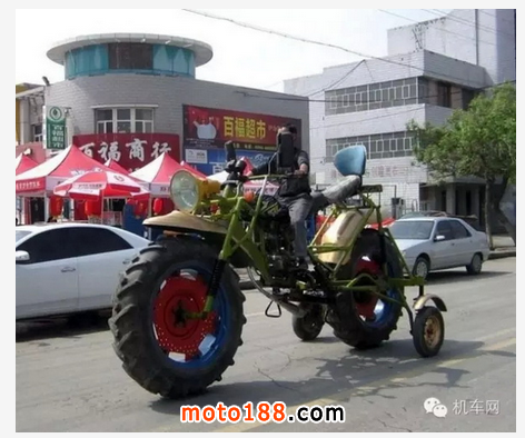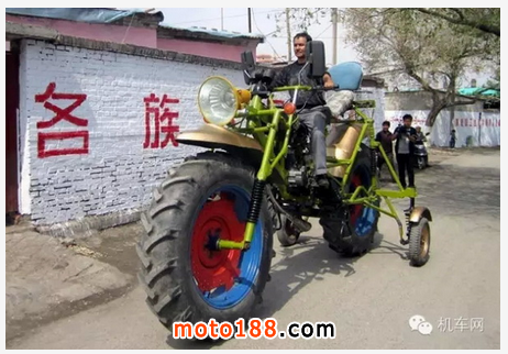 “輪子是250拖拉機(jī)的輪胎,避震器是三輪拖拉機(jī)的避震器,前面的大燈是探照燈。發(fā)動機(jī)是用普通摩托車的發(fā)動機(jī)改裝的,時速能達(dá)到每小時40碼,不過變速箱是我自己設(shè)計,用了之后可以輕松爬坡”。
