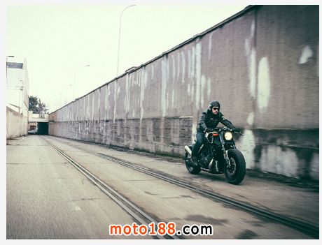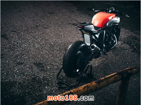 “ 紅外線 ” 采用了一個 Cafe 直線加速賽車的外觀造型,原有的 VMAX 外觀風格已經幾乎消失。車身的圖案,使用了 1985 年 Yamaha GP 車隊的配色。主要的改裝,則包括了以精湛工藝全人手制作而成的鋁合金副車架;精雕細琢之下的油箱安裝設計,讓大幅改動之后的 “ 紅外線 ” 依然維持了標準車原有的油箱容量以及乘坐體驗;鋁制外殼的車身兩側空氣濾清器;定制的 Termignoni 四出一排汽系統;多處的碳纖維組件等等。