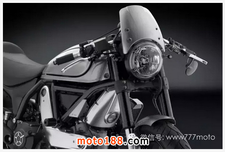 全身白銀色的配色下,加上頭燈上的導流板,全車以Cafe Racer 的風格下去打造,簡單的分離式手把、可調整腳踏、圓翹的椅墊…..等,于其他各項細節,使整臺車更具Cafe Racer 的風格,改上分離式手把后,原本的手把座就變得很突兀,Rizoma 用簡單的巧思,在手把座上直上儀表座,讓原本空虛的龍頭顯得更加緊湊,前剎保護蓋增添細節上的質感,水箱護蓋不只能保護水箱,還能提升視覺質感,側邊下移的牌架,更凸顯Cafe Racer 的風格。
