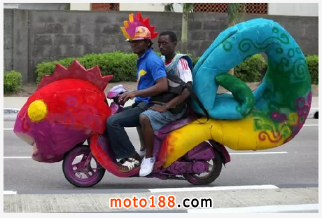 狂歡節,兩個男子騎著一輛裝飾成炫彩動物的摩托車,能不能別用那么無辜的表情看著鏡頭啊。