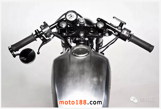 這款車兼具街車和cafe賽車的特色。低矮的分離式車把cafe勁兒十足。當然它也絕非徒有其表,原車掉渣的減震已被換為行程更長的MikesXS減震。為了整體的美觀,原車的儀表組也進行了大換血,只剩下了轉速表。