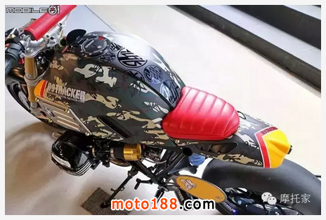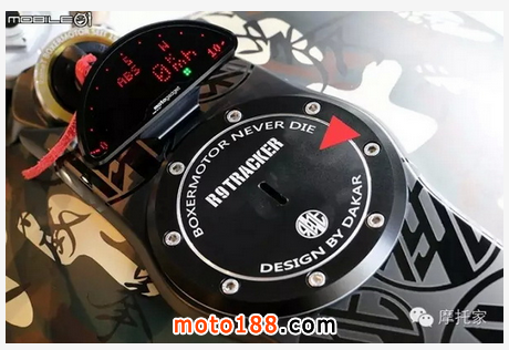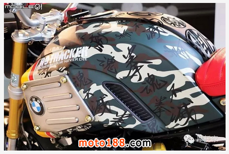 拉近距離,許多車輛改裝的細節漸漸浮現,例如油箱造型就是整臺車最重要的精神所在,上方印有 R9TRACKER,并以迷彩配色做為基底,當然 BMW 的廠徽依然擺放于車輛上,讓人一眼就能認出這臺是 BMW 的車款改裝而來。