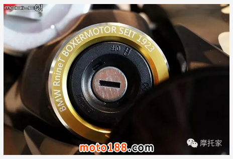 鎖頭外圈也特別設計一組鋁合金裝飾環,上方也有 BMW RnineT BOXERMOTOR SEIT 1923,意思是 BMW 的水平對臥引擎始于西元 1923 年。