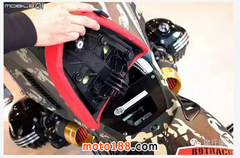 座椅采用紅色縫紉皮面增加視覺效果點綴,而且設計者表示能仿造原車坐墊拆卸,盡可能做到完全不破壞車體結構,可恢復原廠的方式進行概念改裝。