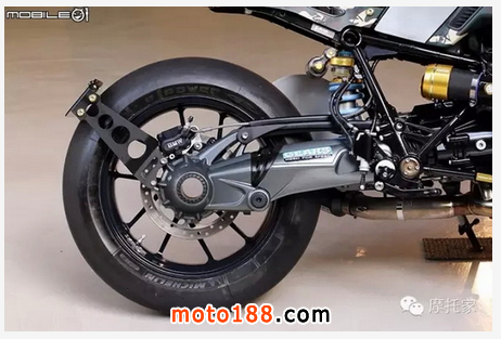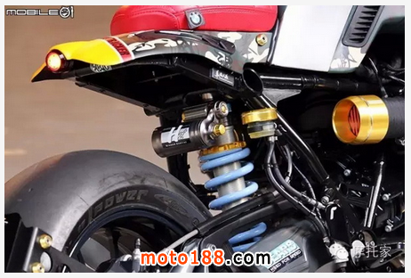 R-nineT 的單搖臂系統比較特殊,因此在改裝方面比較沒有著墨于此,僅在上方貼上 GEARS 集亞避震器的貼紙而已。