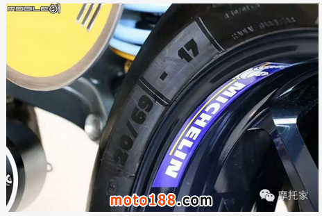 前后輪均采用 MICHELIN 米其林所生產的競技胎種,因此后輪輪胎規格也是少見的 20/69-17 全熱熔胎種。