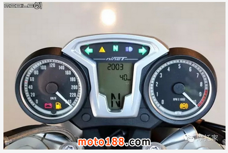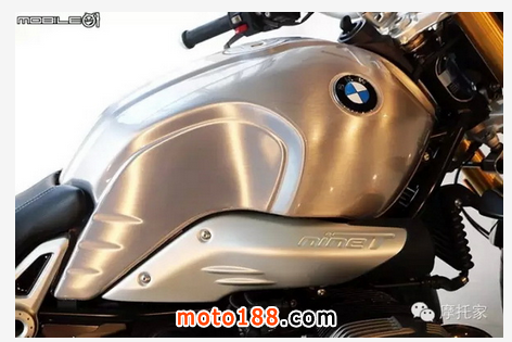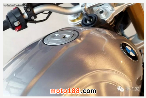 做為選配的發絲紋油箱烤漆是這次最大的賣點,而且發絲紋還具有兩種版本可供選配,不過這次只有拍到一種版本,稍微有些可惜;底下的 nineT 也是這款車最好識別的特征之一。