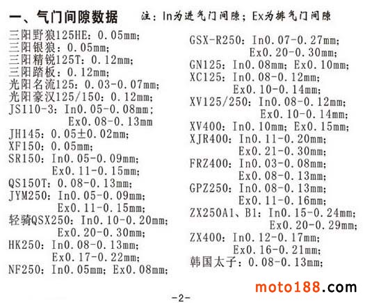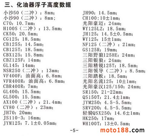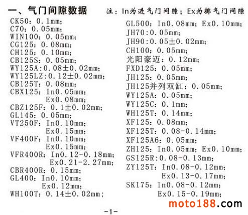 調整摩托車氣門間隙、化油器浮子高度數據,在實際調整中還需要結合實際情況作相應變動。