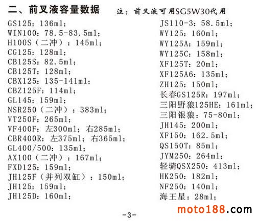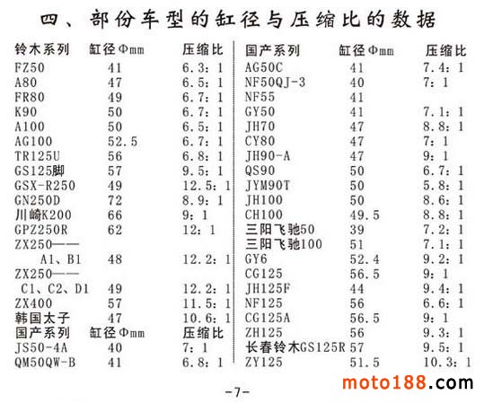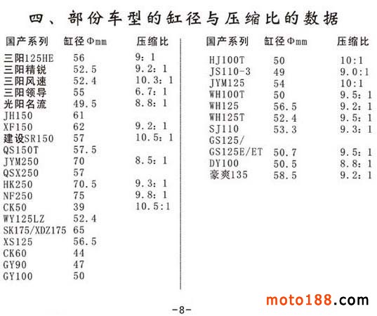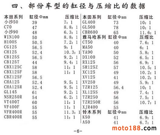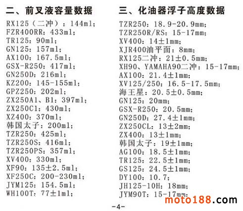 摩托車的氣門間隙、化油器浮子高度、前叉液容量、缸徑與壓縮比數據