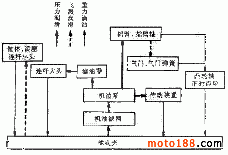 CG125 潤滑系統是按下圖 所示循環的,筆者結合該循環圖和對機油消耗試驗的分析總結如下。