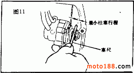 先使發(fā)動(dòng)機(jī)低速運(yùn)轉(zhuǎn),觀察機(jī)油泵的調(diào)整擋板,然后使發(fā)動(dòng)機(jī)熄火,讓調(diào)整擋板滑到最右端,用塞尺檢查最小柱塞行程,如圖 11所示。最小柱塞行程應(yīng)為 0.20 ~ 0.25mm ,若測(cè)出的值與此值不符,則應(yīng)進(jìn)行調(diào)整。行程過(guò)大應(yīng)減少墊片,行程過(guò)小,則應(yīng)增加墊片。