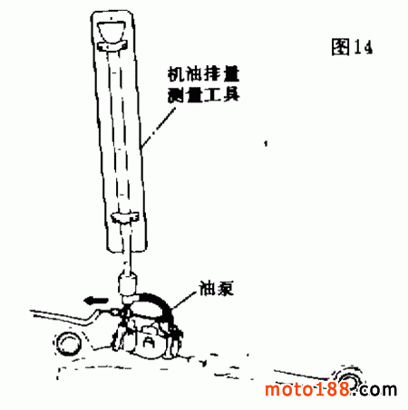 在機(jī)油排量測(cè)量工具(鈴木車專用工具 09900—21602 )中裝滿鈴木 CCI 潤(rùn)滑油,然后將其連接于泵的真空面,如圖14。啟動(dòng)發(fā)動(dòng)機(jī),使發(fā)動(dòng)機(jī)的轉(zhuǎn)速保持在 2000r/min ,工作 6min 。這時(shí),量具上的讀數(shù), FZ50 型摩托車應(yīng)在 1.02 ~ 1.26mL 范圍內(nèi); TR125 型摩托車應(yīng)在 4.2 ~ 5.1mL 范圍內(nèi)。