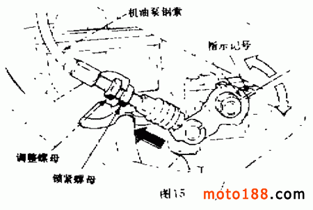 ( 1 )機(jī)油泵鋼索的調(diào)整將油門(mén)轉(zhuǎn)把轉(zhuǎn)到極限位置,此時(shí),機(jī)油泵上的指示記號(hào)應(yīng)與控制桿上的記號(hào)對(duì)齊,如圖 15所示。如果沒(méi)有對(duì)齊,則松開(kāi)鎖緊螺母,轉(zhuǎn)動(dòng)調(diào)整螺母,使這兩個(gè)指示記號(hào)對(duì)齊,然后再擰緊鎖緊螺母。