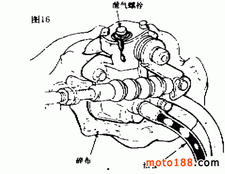 ( 2 )排泄機(jī)油泵內(nèi)的空氣使發(fā)動(dòng)機(jī)熄火,將機(jī)油箱內(nèi)注滿機(jī)油,然后如圖 16所示,用碎布包住機(jī)油泵,擰松機(jī)油泵頂部的泄氣螺栓,當(dāng)泄出的機(jī)油中不再有空氣氣泡時(shí),再將泄氣螺釘擰緊。