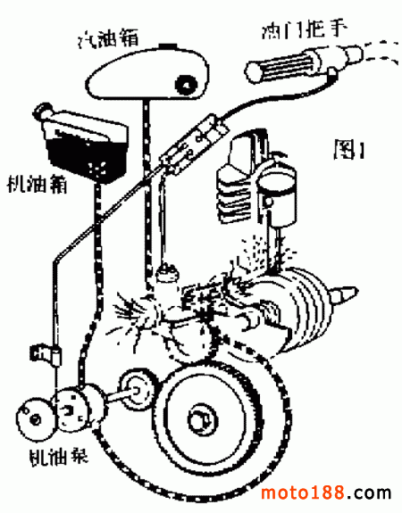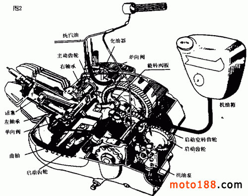 二沖程發(fā)動(dòng)機(jī)潤(rùn)滑系統(tǒng)的形式可分為混合潤(rùn)滑和分離潤(rùn)滑兩種。