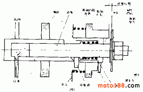 機(jī)油泵也有兩種結(jié)構(gòu)型式。一種是上述第一種分離潤(rùn)滑方式采用的型式,其結(jié)構(gòu)如圖 3所示。這種機(jī)油泵的工作原理是:柱塞銷在柱塞彈簧的作用下,始終緊靠在分配器的凸輪斜面上。當(dāng)發(fā)動(dòng)機(jī)工作時(shí),蝸輪及分配器旋轉(zhuǎn),同時(shí)推動(dòng)柱塞左、右動(dòng)作。當(dāng)柱塞移到最右邊時(shí),分配器的油孔恰好對(duì)準(zhǔn)進(jìn)油孔,潤(rùn)滑油便被吸入;當(dāng)柱塞向左移動(dòng),分配器的油孔對(duì)準(zhǔn)出油孔時(shí),潤(rùn)滑油便被排出。調(diào)整擋板隨柱塞由最右邊向左移動(dòng),到接觸控制凸輪的端面時(shí)止,所移過(guò)的距離叫柱塞行程。控制凸輪在控制凸輪彈簧的作用下,其斜面始終保持與螺釘接觸。當(dāng)轉(zhuǎn)動(dòng)油門(mén)轉(zhuǎn)把時(shí),油門(mén)鋼索與機(jī)油泵鋼索連動(dòng),控制凸輪在機(jī)油泵鋼索的操縱下,轉(zhuǎn)動(dòng)的同時(shí)又向左移動(dòng),柱塞行程便加大。當(dāng)油門(mén)轉(zhuǎn)把及控制凸輪處在自由位置,且柱塞移到最右邊時(shí),調(diào)整擋板與控制凸輪端面的距離稱為最小柱塞行程。車型不同,最小柱塞行程的規(guī)定值也不同。通過(guò)調(diào)整墊片的厚度,可以調(diào)整最小柱塞行程的大小。