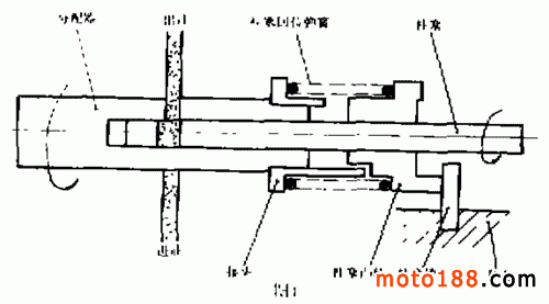 另一種分離潤(rùn)滑方式是 CCI 潤(rùn)滑系統(tǒng),這是鈴木系列摩托車專用潤(rùn)滑系統(tǒng),其結(jié)構(gòu)形式如圖 2所示。這種潤(rùn)滑系統(tǒng)由機(jī)油泵將潤(rùn)滑油通過(guò)輸油管道輸送到各個(gè)需要潤(rùn)滑的部位,其中一根輸油管將潤(rùn)滑油送到曲軸左端軸承,然后經(jīng)曲軸上的油道流入連桿大端,潤(rùn)滑大端的滾針軸承;另一根輸油管將潤(rùn)滑油輸送到曲軸右端軸承和旋轉(zhuǎn)閥盤(pán),在離心力作用下,旋轉(zhuǎn)閥盤(pán)上的潤(rùn)滑油被甩到連桿小端滾針軸承、活塞及汽缸壁上,從而起到潤(rùn)滑作用。鈴木 FZ50 、 FA50 、 A50 、 K90 、 A100 等型號(hào)的摩托車均采用這種潤(rùn)滑系統(tǒng)。