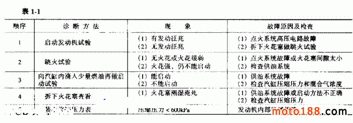 ( 3 )機械故障。汽缸壓縮壓力不足。診斷這種故障時,首先要判明故障所在系統,然后在該系統進行檢查,查明故障所在部位后予以排除。判明故障所在系統,一般先從點火系統入手(因點火系統故障率較高)。首先檢查點火系統的技術狀況是否正常,若正常,再檢查供油系統是否存在故障,最后考慮發動機內部機械故障的影響。冷機不易啟動故障的診斷順序見表 1-1 所示。