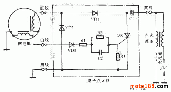 將火花塞從汽缸蓋上拆下,再將拆下的火花塞裝在高壓線帽上,使火花塞殼體靠在汽缸蓋上。打開電源開關,踏動啟動蹬桿,檢查火花塞是否跳火。若火花呈藍白色或紫藍色,并在跳火時發出“啪、啪”的聲響,說明火花較強(但還不能證明火花塞完全工作良好,因為壓縮沖程終了時,汽缸內火花塞電極間的壓力約為 650 ~ 700kPa ,在此壓力下,火花必然會減弱);若火花紅而短,或根本無火花時,則應進一步檢查。將高壓帽旋下,使高壓線頭距汽缸蓋 4 ~ 6mm ,然后打開電源開關,踏動啟動蹬桿,此時,高壓線頭與汽缸蓋間若有強烈的火花,說明火花塞連碳或損壞,應仔細檢查火花塞電極間是否積碳嚴重,間隙是否在 0.5 ~ 0.7mm 之間。積碳應用竹簽刮除,不能用小刀、刮刀等金屬工具,但絕緣體裙部周圍的積碳,可用較尖的鐵針進行清理。若積碳清除干凈,間隙調整合適后,火花塞仍不能正常跳火,說明火花塞已損壞,應更換火花塞,重新進行跳火試驗。若檢查高壓導線火花微弱或無火花,說明故障出在點火系統。一般采用逐點搭鐵試火法診斷,先確定故障區段,然后進一步找出故障的確切部位。