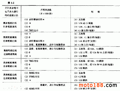 5. 電子點火器的檢查如圖 1-72 所示為典型的電子點火系統電路圖。用萬用表電阻擋測量電子點火器各引出線之間的電阻值,根據測出的數值即可判斷電子點火器有無故障。測量時的接線方法和判斷結論見表 1-2 。