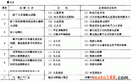 用萬用表 R×1 電阻擋測量磁電機觸發線圈引出線與搭鐵線之間的電阻,當阻值為幾十歐時,說明線圈無故障;當阻值為零時,說明線圈短路;當阻值為無窮大時,說明線圈斷路。若線圈短路或斷路,應予更換。火花塞跳火太弱或不跳火的診斷順序見表 1-3 所示。