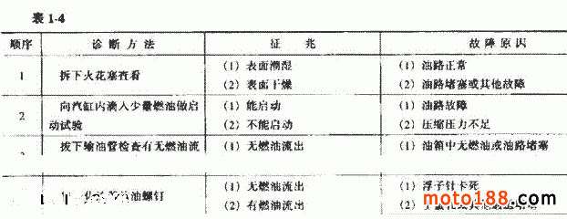 此時,應拔下輸油管,檢查是否有燃油供給,若無燃油供給,應檢查油箱中有無燃油。若油箱中有燃油,應檢查油箱蓋上的小孔、燃油開關和燃油濾清器等是否堵塞。若輸油管有燃油供給,應卸下化油器進行清洗,將各油、氣道疏通,徹底清除沉淀物、雜質及鐵銹等雜物。清洗干凈后,再用打氣筒將各孔吹凈,然后進行啟動試驗。可燃混合氣未能進入汽缸的診斷順序見表 1-4 所示。