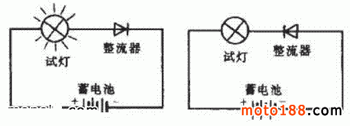 用蓄電池作電源,取一只儀表燈泡(燈泡額定電壓應與蓄電池電壓相等),對硅二極管進行單向導電性能檢查。方法見圖 2-19 所示:在蓄電池正負極上各接一根導線,使其通過試燈交替地接在硅二極管的兩電極上,這樣測試兩次。如果試燈一次亮一次不亮,說明這只硅二極管是良好的;如果兩次都亮,說明硅二極管已擊穿短路不能使用;如果兩次測試試燈全不亮,說明硅二極管內部斷路而損壞。