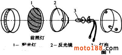 摩托車(chē)前照燈的典型結(jié)構(gòu)如上圖1 所示。前照燈的光學(xué)系統(tǒng)由燈泡、反射鏡和配光鏡三部分組成。現(xiàn)今大多數(shù)國(guó)產(chǎn)摩托車(chē)上使用的是半密封式前照燈(見(jiàn)圖1 ),多為圓形和方形。另一種較為先進(jìn)的全封閉式大燈,其結(jié)構(gòu)是把反光鏡與配光鏡制成一體,內(nèi)腔充以惰性氣體,燈絲直接焊在反射鏡底部,形成一個(gè)大燈泡。由于內(nèi)腔完全封閉,因此,反射鏡不受大氣灰塵和水蒸氣污染,發(fā)光率較高。但因其成本較高和更換時(shí)只能更換大燈總成,在國(guó)內(nèi)未能廣泛使用。
