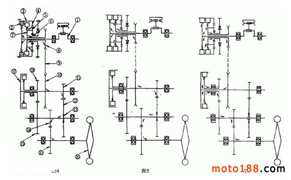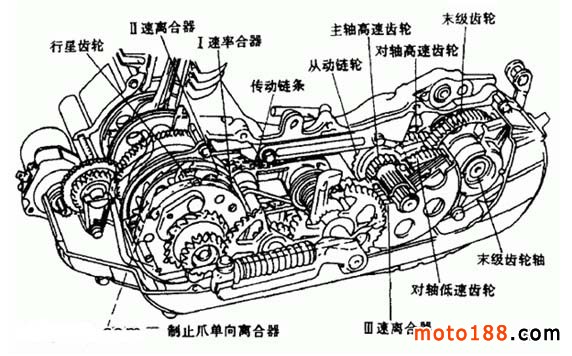 ① 曲軸 →②I 速離合器 →③Ⅱ 速離合器 →⑧ 驅動齒輪 →⑨ 驅動鏈條 →⑩ 從動齒輪 → ⒄Ⅲ 速離合器 → ⒅主軸高速齒輪 → ⒆副軸高速齒輪 → ⒁ 副軸齒輪 → ⒂末級齒輪 → ⒃后輪。