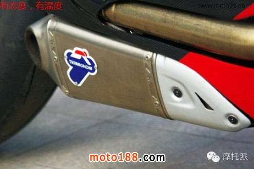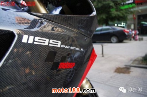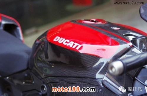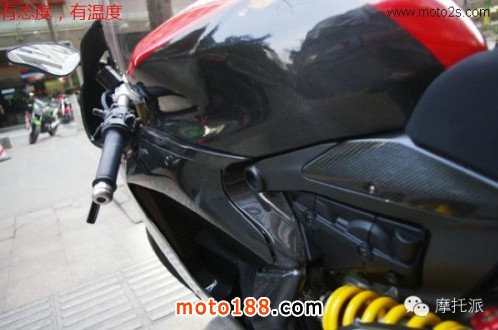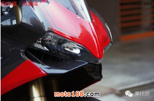 犀利的車頭猶如張開血盆大嘴的鯊魚,碳纖維改裝件已經(jīng)取代了原車的進(jìn)氣、包板和頭罩,同時(shí)全新的配色方案讓杜卡迪紅和碳纖維完美統(tǒng)一。