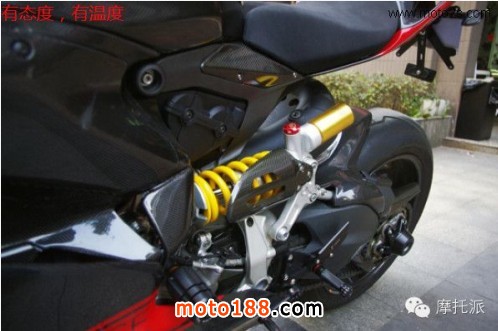 負(fù)角度的后減震方案也是1199的技術(shù)革命之一,裸露在外的黃色減震非常的養(yǎng)眼,碳纖維減震護(hù)蓋取代了原來的ABS塑料護(hù)蓋。