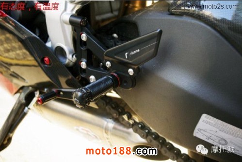 Rizoma的升高腳踏特寫,注意下面的排氣是TERMIGNONI鈦合金排氣,動(dòng)力有效提升約10%。