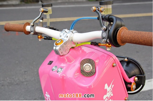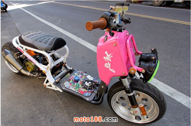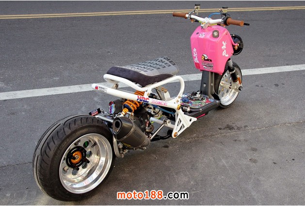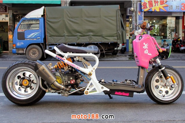 建富車業的鄭老板,在去年接觸到朋友的后移改裝車,就一頭栽入后移世界,在網絡上選定了HONDA ZOOMER 來當改裝車「ZOOMER 在美國是相當熱門的改裝車款,有些設計臺灣沒有,還要從美國進口!」,這兩個前4J 后7J 的寬胎輪圈,就是苦等數月,才收到的美國部品。