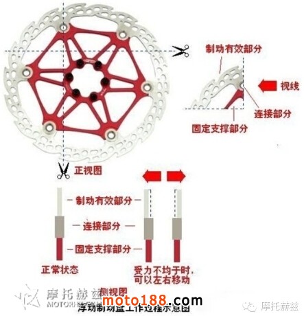 當碟盤剎車時,會產生高溫,碟盤會有熱脹的情況出現,浮動碟會有輕微擺動,作出適當的角度,跟剎車皮有一個最合適的磨擦面,保持剎車的穩定性,碟盤的面積加大,也有助于碟盤的散熱功能。長時間剎車或大力剎車時,剎車碟摩擦面會因劇烈摩擦產生高溫而發生縱向膨脹(也就是外緣直徑擴大)。如果是一體化的剎車碟,高溫膨脹的外緣和較冷的支架為剛性聯結,會產生強大的內部拉扯應力,嚴重時會導致碟面橫向扭曲變形,而剎車碟直徑越大,這種變形就越明顯。為獲得較大的剎車力矩,高性能剎車系統都使用了大直徑剎車碟,為避免剎車碟嚴重熱變形導致剎車故障,工程師將剎車碟外緣摩擦面和內側支架分開,中間用特殊的非剛性結構聯結,也就是浮動聯結。這樣摩擦面和支架就成了相對獨立的受力面,當摩擦面受熱膨脹時,浮動結構允許摩擦面有一定的自由縱向膨脹空間,這樣就可以消除與支架間產生內部拉扯應力的條件,從而保持摩擦面不會因受熱不均而導致扭曲變形,使剎車更加穩定可靠。