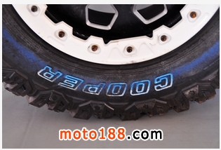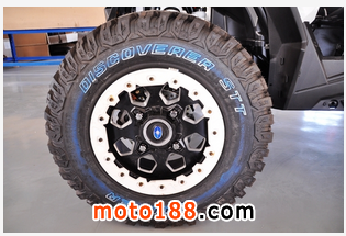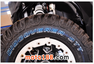 一雙合適的高性能的鞋,不僅能夠令速度提高,也能起到穩(wěn)固的作用。輪轂改裝為防脫圈輪轂,造型比較溫潤(rùn),如果是沙漠行駛的話會(huì)改變胎壓,極易出現(xiàn)脫圈的情況,改裝了防脫圈就像系緊了鞋帶,不會(huì)讓你在沖刺的時(shí)候被鞋帶散開(kāi)所牽絆。更換了固鉑DISCOVERER STT輪胎(Super Traction Tread,超級(jí)牽引輪胎),采用Armor-Tech3技術(shù)的結(jié)構(gòu)令輪胎異常堅(jiān)固,能夠從容應(yīng)對(duì)戈壁路況下外界異物的強(qiáng)烈沖擊。