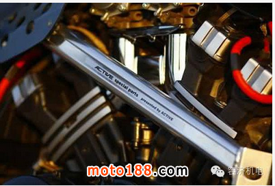 為了增強雙搖籃式車架的剛性和穩定性,車主加裝了由日本著名改裝廠商ACTIVE推出的車架張力斜拉桿,輕量化鋁合金材質表面金屬拋光處理,剛性極佳,做工精致美觀,使車身線條顯得更加飽滿,在增強車架整體剛性的同時提高操控性能,兼顧保護發動機的功效,可謂是一舉兩得。