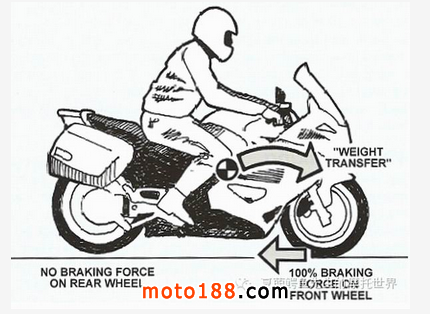 因?yàn)檐囆捅旧磔S距較短,運(yùn)動(dòng)型摩托車重量轉(zhuǎn)移到前輪的速度比巡航車型要快得多,重量從后輪轉(zhuǎn)移到前輪上的速度太快,后輪和地面的摩擦力就會(huì)很快不足,后剎就會(huì)很快沒(méi)有效率,剎車力無(wú)法通過(guò)摩擦有效的傳導(dǎo)到地面上,就會(huì)很容易造成抱死和側(cè)滑。這也就是大部分賽車手和賽道騎士避免使用后剎的原因。