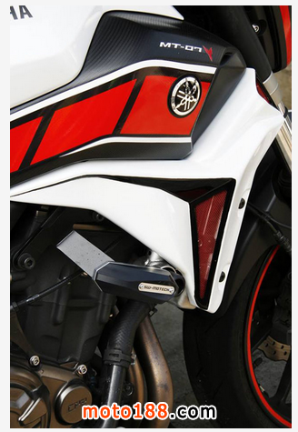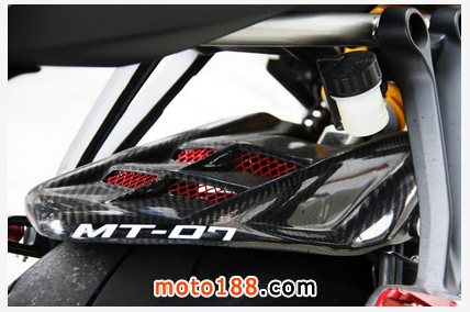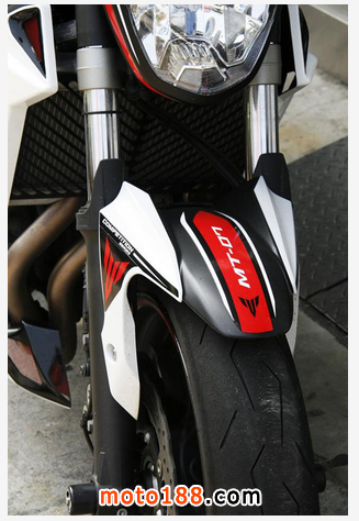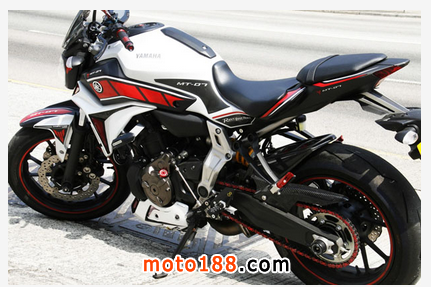 首先,這臺MT07貼上Yamaha周年版拉花車身貼紙連輪圈貼,外觀非常醒神,加上 兩邊的水箱邊冚及肚兜冚,營造STREETFIGHTER車款的感覺。另外,添置了實用的SW-MOTECH保護支架、TERMIGNONI排氣喉、 LIGHTECH腳踏、OHLINS尾避震、BREMBO直泵牛角、碳纖維尾沙板及多項RIZOMA優質改裝部品等等........,令車款外觀與性能 也有所提升及美化。