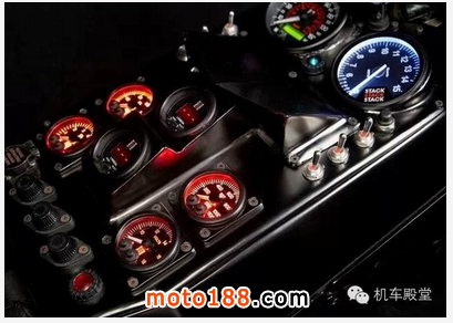 金屬置地的儀表盤(pán)放置在油箱上部,這一點(diǎn)和B組的拉力車很相似。方便讀取溫度,油壓,速度,轉(zhuǎn)速和電壓。線路都包裹在機(jī)身周圍,猶如金蛇纏繞。