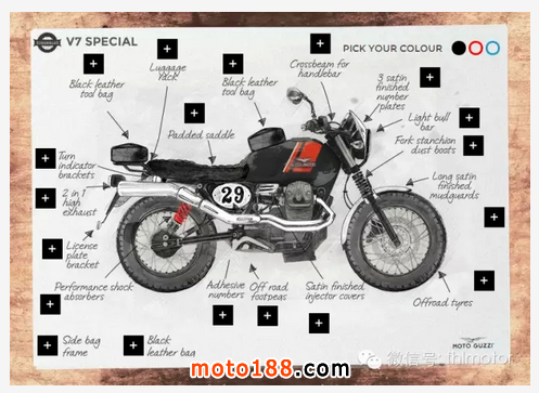 MOTO GUZZI推薦四種改裝風(fēng)格,這四種風(fēng)格獨(dú)特的V7改裝套件,都將讓V7成為焦點(diǎn)。MOTO GUZZI的所有配件均可任意搭配組合,單獨(dú)購(gòu)買,滿足車主最瘋狂的想象力與創(chuàng)造力。