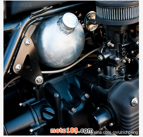 改裝部件更多的采用事故車的尸體,如GSX-R的前插、CBR的面板、還有CB750的油箱。這些本來都要當作廢鐵的零件現在又重新煥發了生命,我們聞所未聞的一輛全新的美式bobber就這樣誕生了。