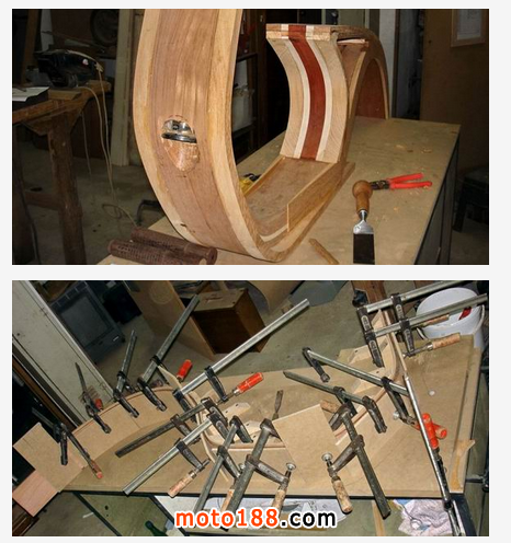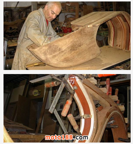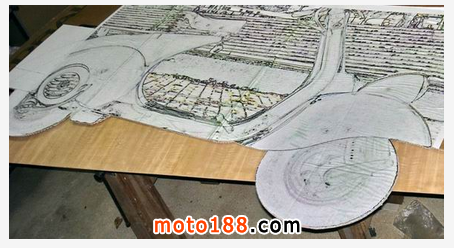 這臺木質摩托車是專門為他心愛的女兒Daniela 所創造,圖中除了可以看到最終的樣子,更是可以一睹這輛車的制作過程。可以看到Carlos Alberto 先是畫了一幅心中摩托車的草圖,然后根據草圖選取合適的木材。