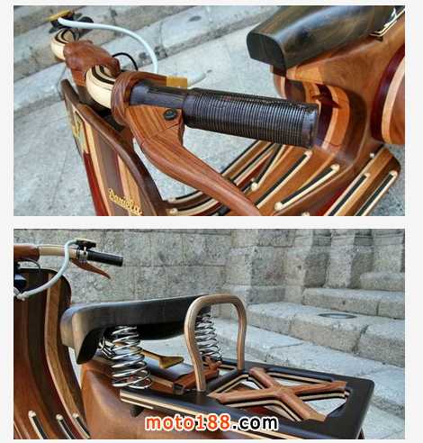 最大的挑戰相信就是給木頭材質塑形的過程,數十只扳手齊心協力搞定了這一切。Carlos Alberto 為車身設計了漂亮的意大利Napolitan 條紋,無論是輪箍內部、腳撐、車把、坐墊、燈罩、坐架甚至車牌,全部運用了木頭材質,配合上Napolitan 條紋足以令你心動。突然好羨慕Daniela 有位這樣的父親!